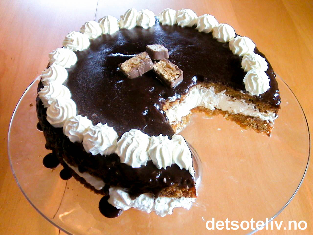 Pynt kaken med pisket krem og eventuelt noen skiver med Snickers sjokolade i midten.