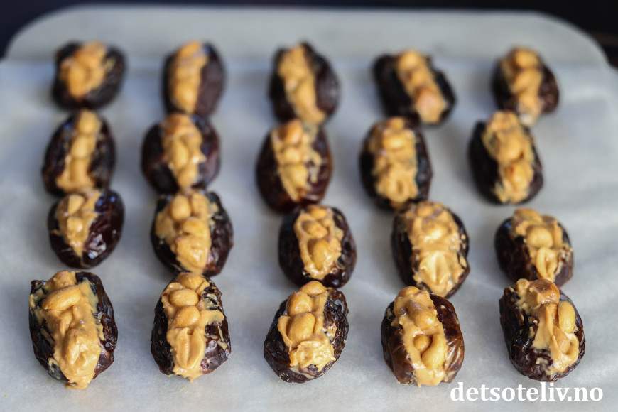 Fyll opp hulrommet inni dadlene med peanøttsmør, og press ned noen salte peanøtter på toppen.