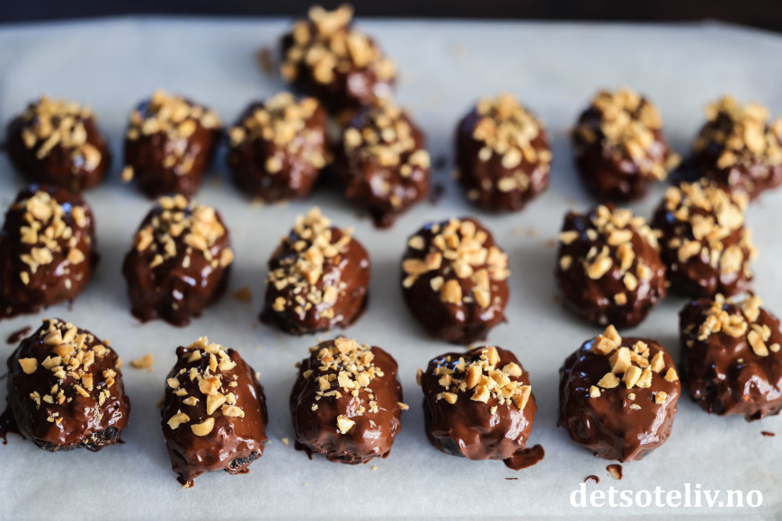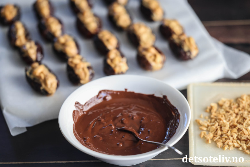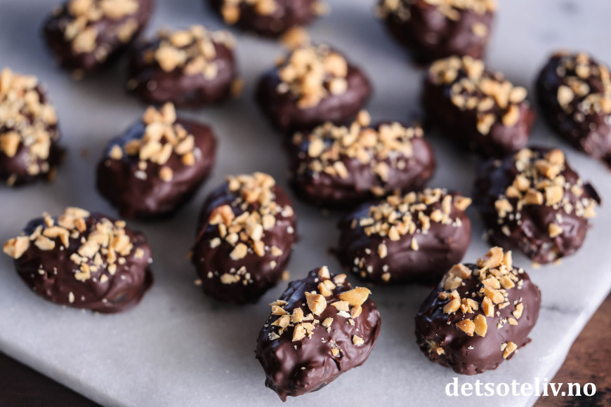 Smelt kokesjokolade. Dypp dadlene raskt i den smeltede sjokoladen og legg dem på det bakepapirdekkede brettet. Dryss over fint hakkede peanøtter.