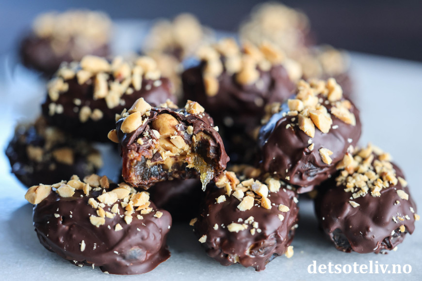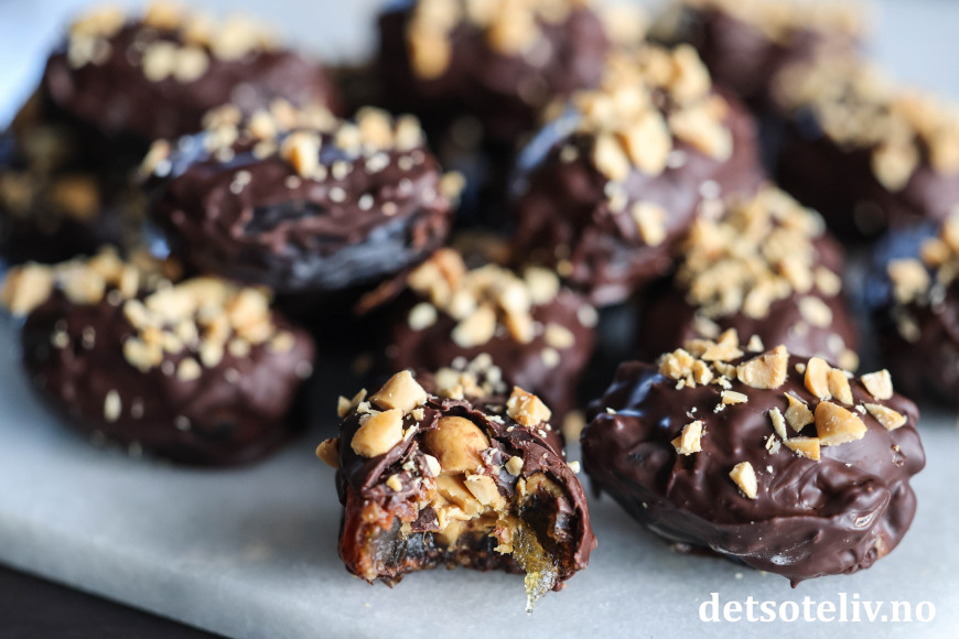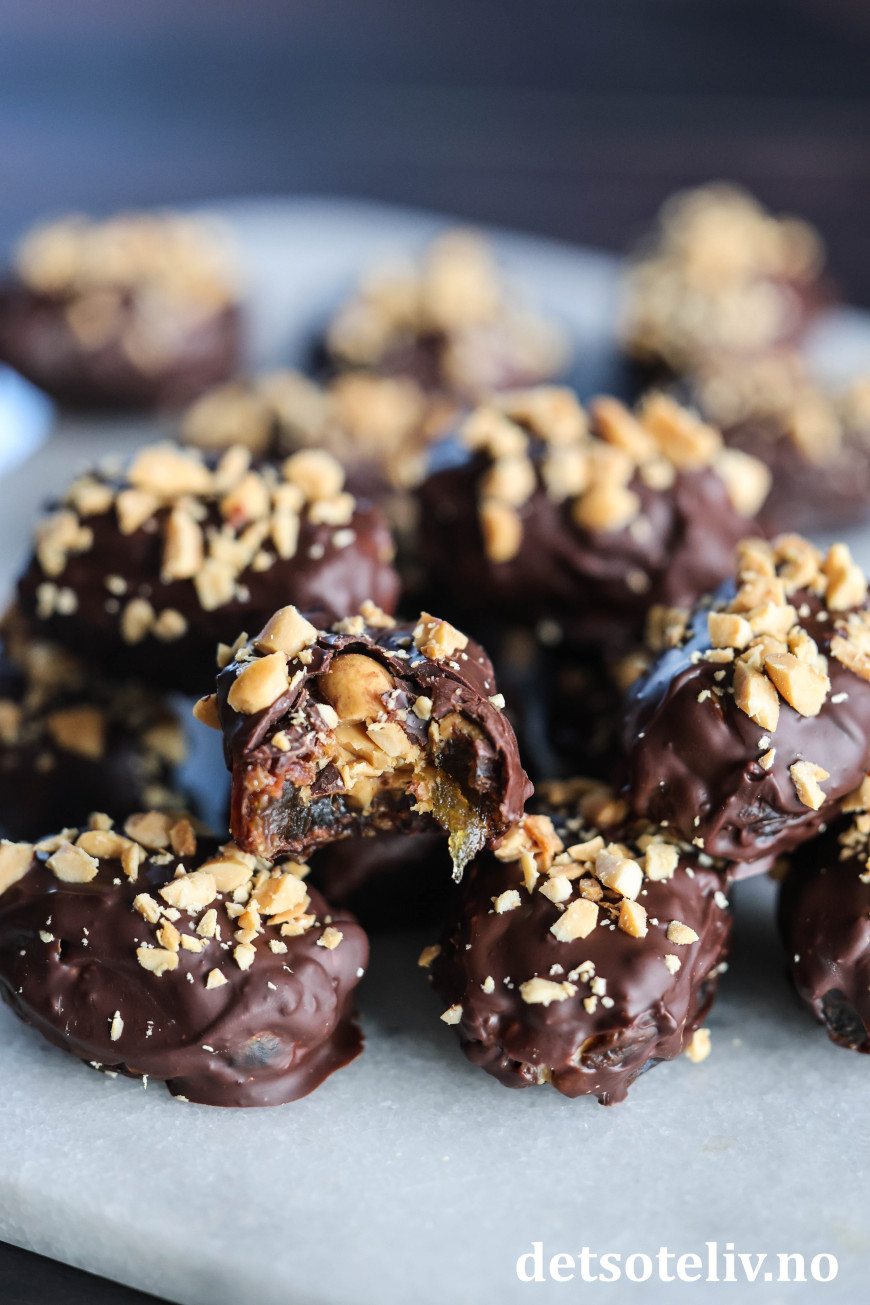 Med dadler, peanøttsmør, salte peanøtter og mørk sjokolade kan du lage kjempegode Snickersdadler!