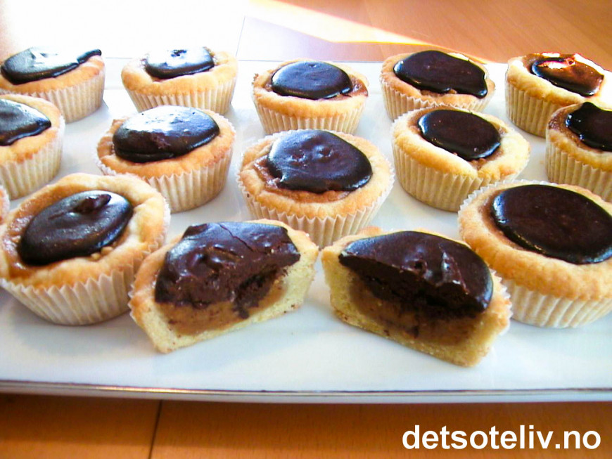 Rør sammen fyllet og fordel i formene ved hjelp av to teskjeer. Stek midt i ovnen ved 200°C i 12 min. Avkjøl helt og løsne kaken forsiktig ut av muffinsbrettet.