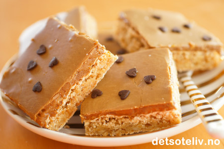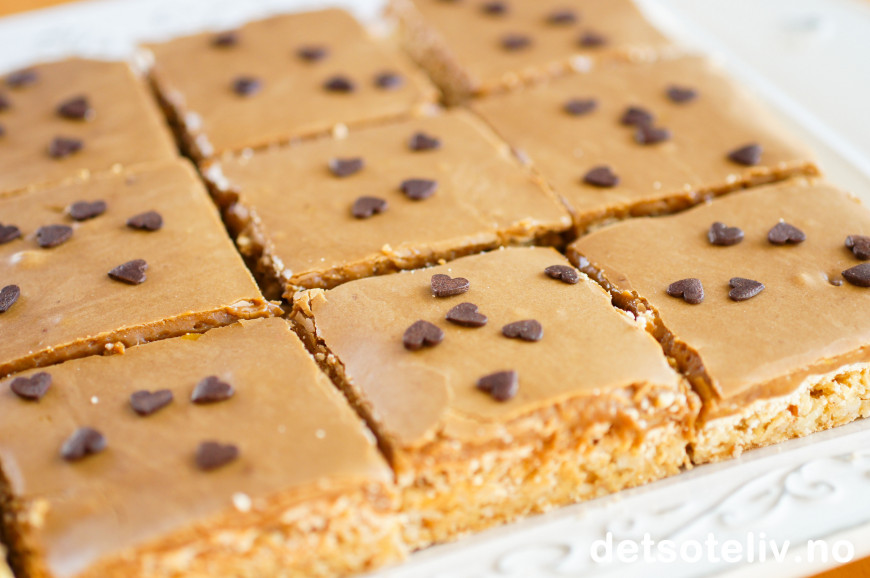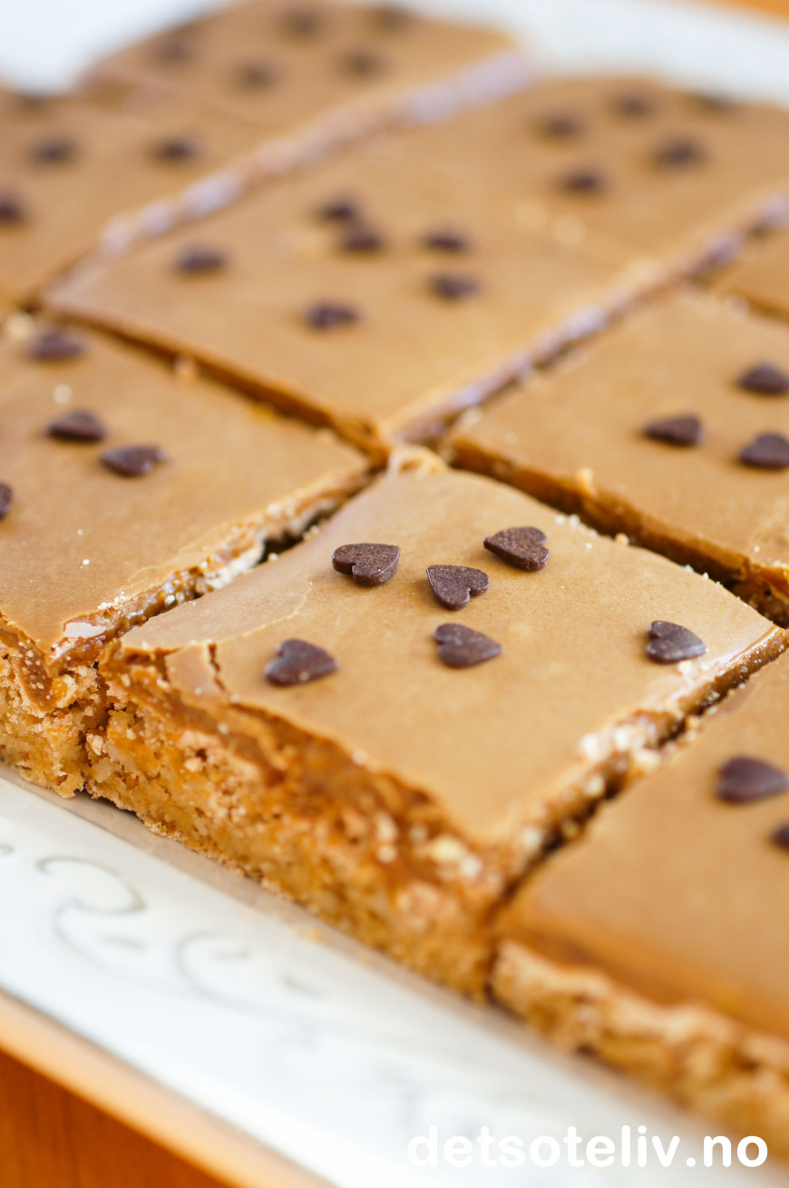 Vil du prøve denne kaken med mørk glasur, se Snickerskake i langpanne med mørk sjokoladeglasur.