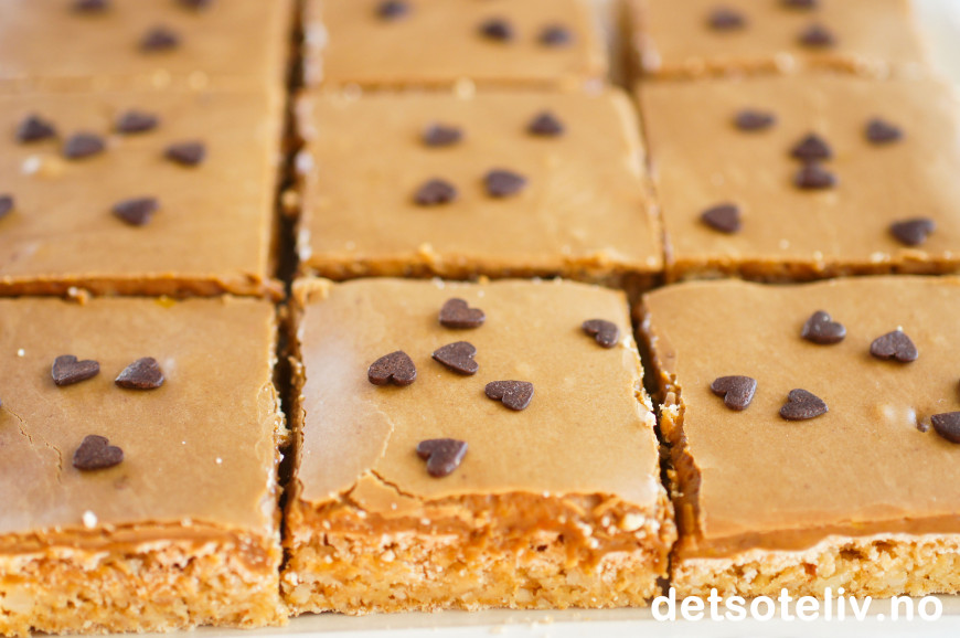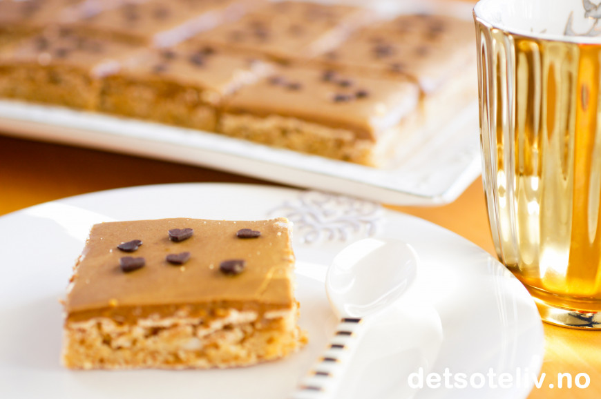 Smør over kaken og del kaken opp i firkanter.