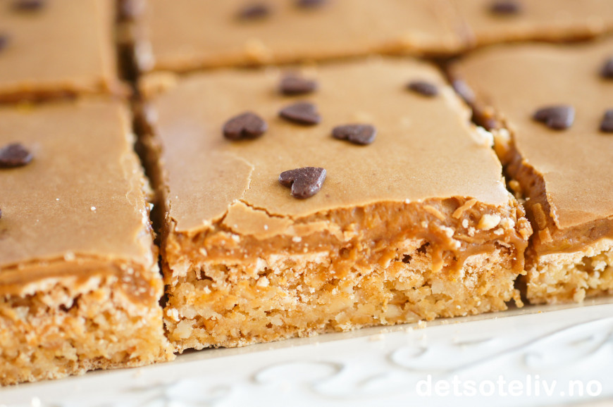 Mange elsker "Snickerskake" og kaken finnes i mange varianter. Her har du en enkel versjon som stekes i langpanne. Også denne langpannekakeversjonen kan varieres ved at du kan bruke enten mørk eller lys kokesjokolade i sjokoladeglasuren. Varianten du finner her er laget med lys kokesjokolade, som gir en mild og nydelig smak på kaken.