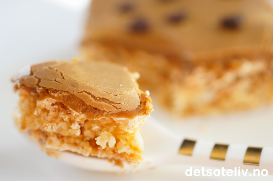Fordel deigen i en stor, bakepapirkledd langpanne (ca 30x40 cm). Stek kaken midt i ovnen ved 180°C i 20-25 min.