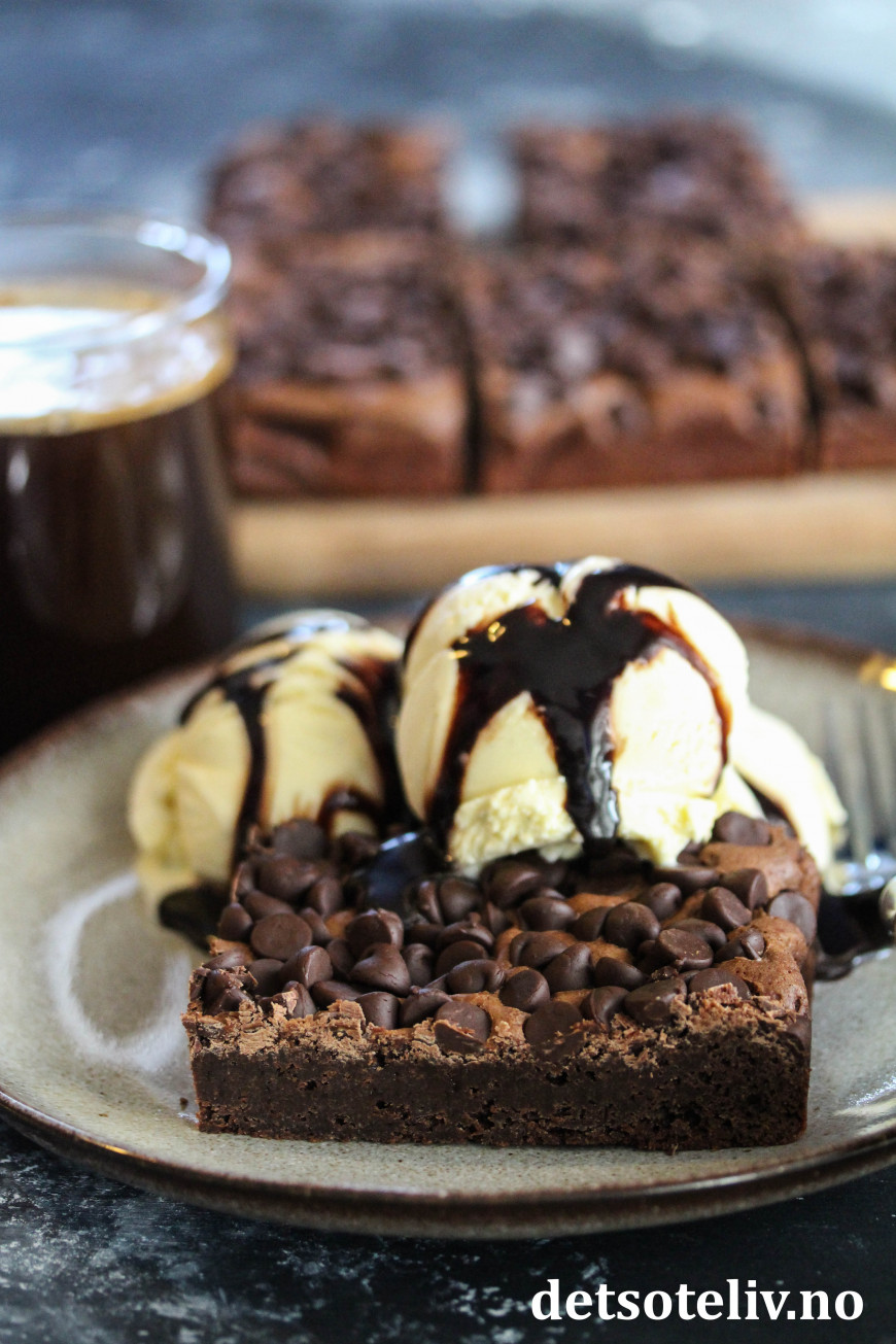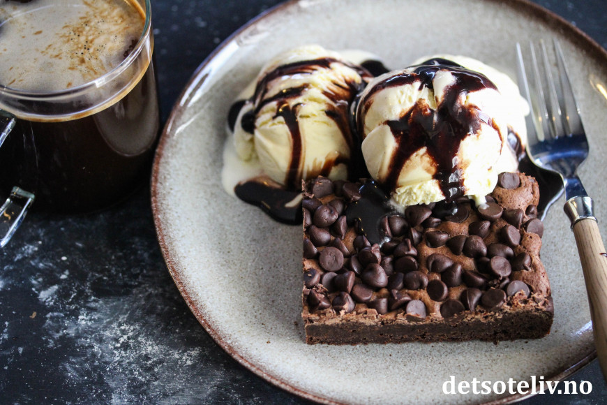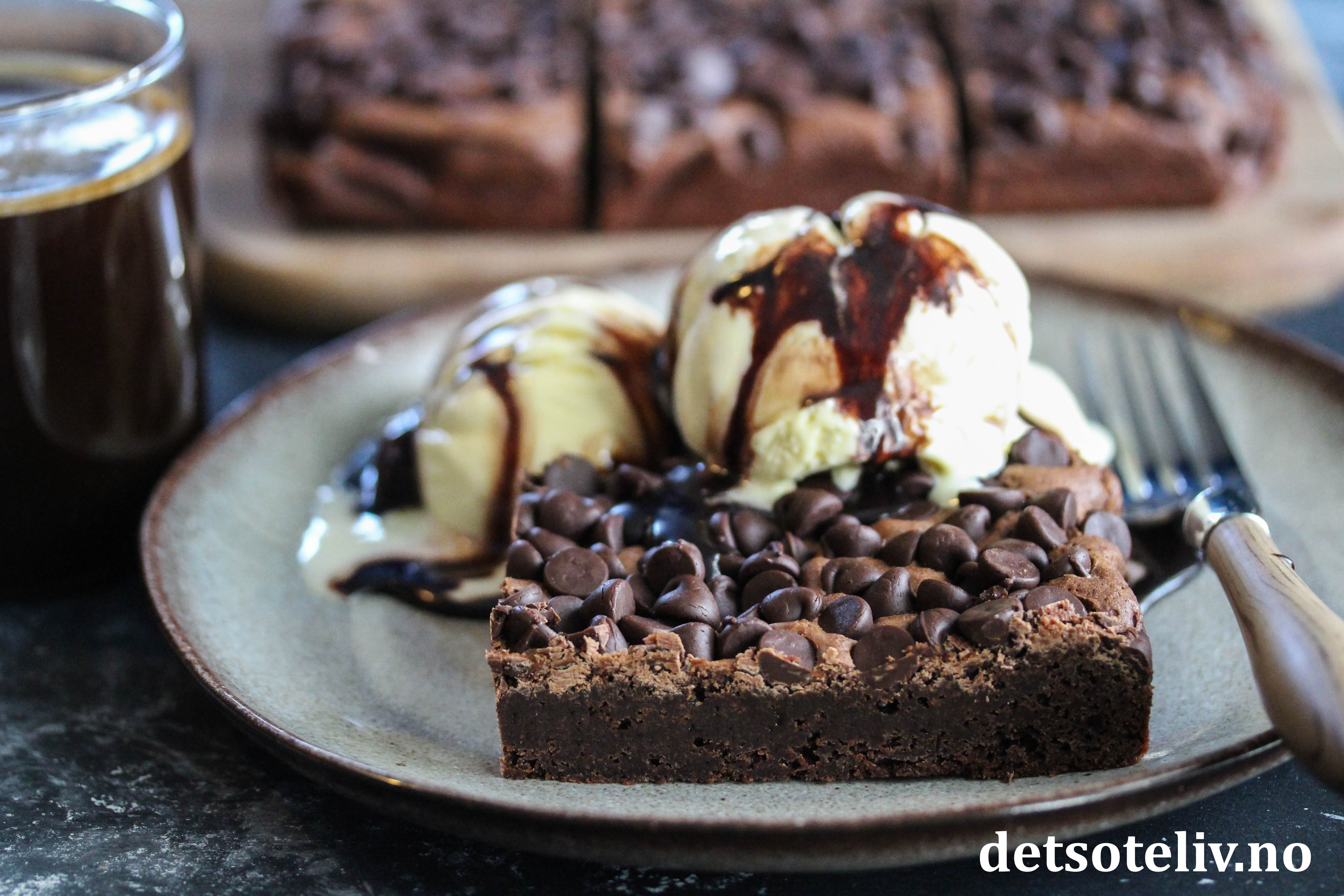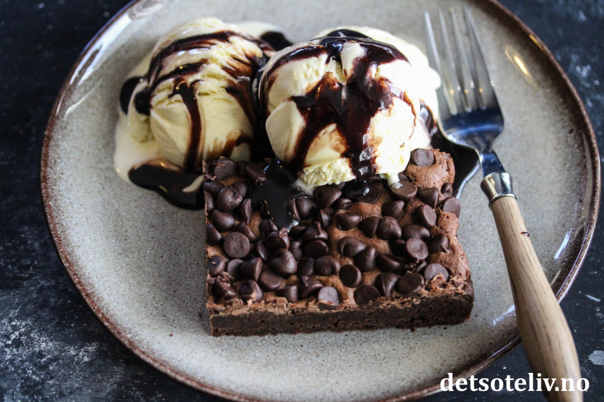 Sykt gode brownies, som serveres i store stykker sammen med vaniljeis og sjokoladesaus.