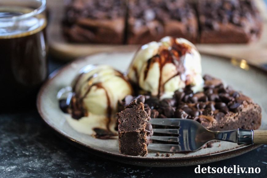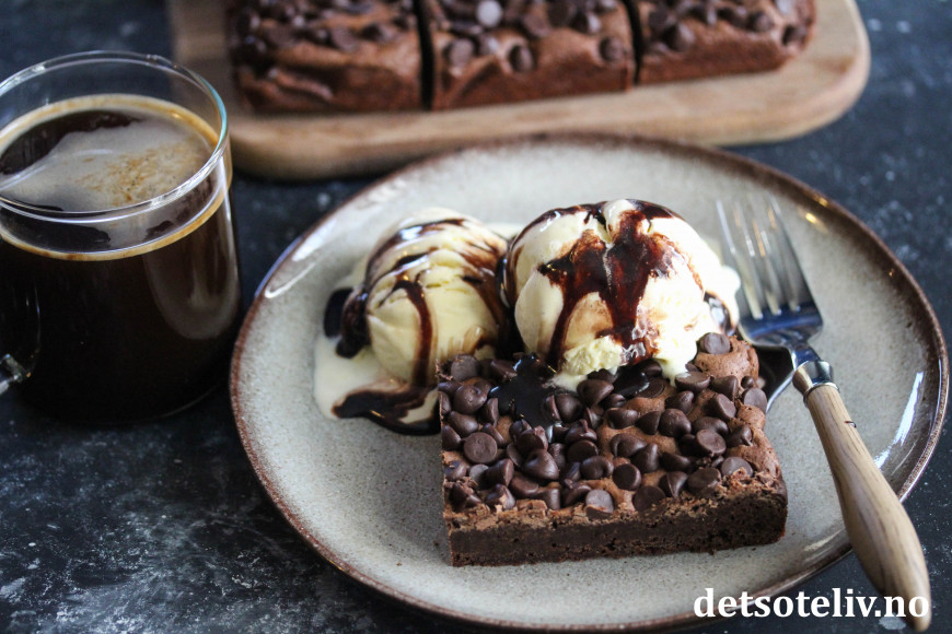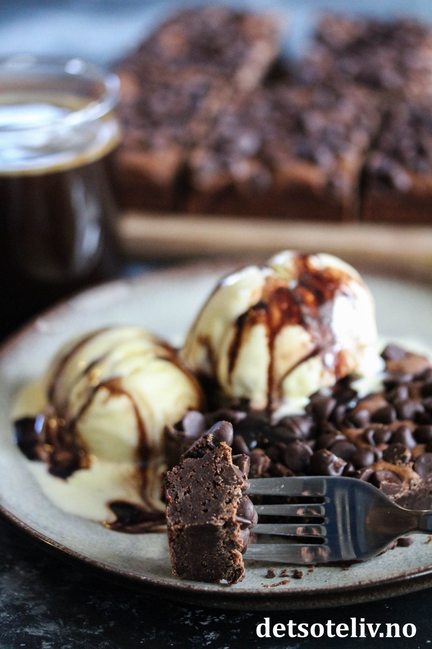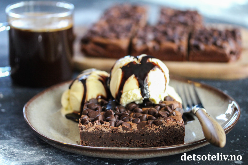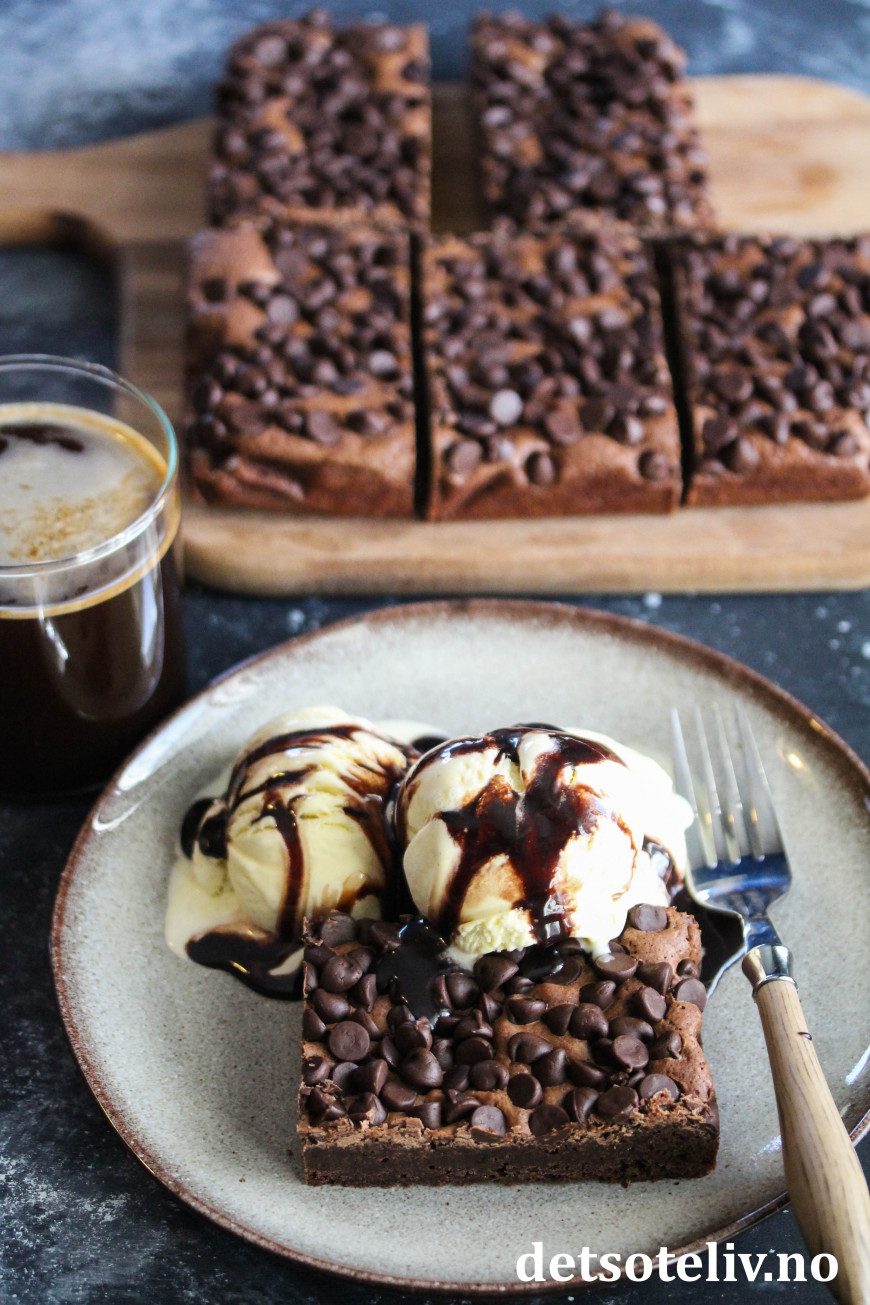 Sykt gode brownies, som serveres i store stykker sammen med vaniljeis og sjokoladesaus.