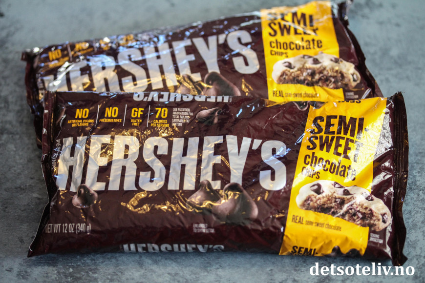 ♥ Amerikanske chocolate chips fås kjøpt i noen velassorterte matbutikker (blant annet hos Meny og i nettbutikken til importøren www.oluf.no). Alternativt går det like greit å bruke andre varianter av sjokoladeknapper eller grovt, hakket kokesjokolade.