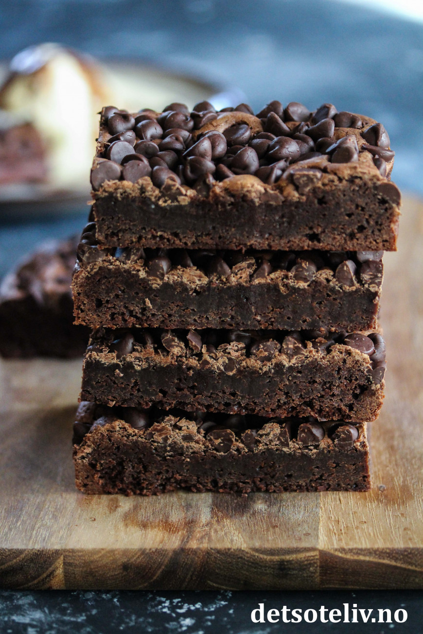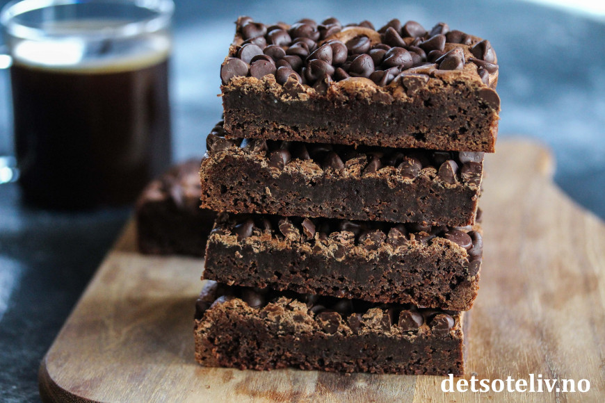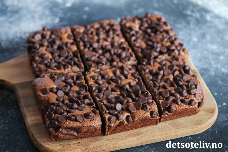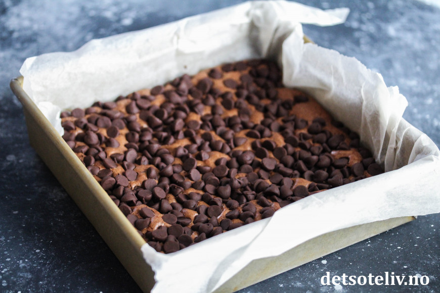Ha deigen i en kvadratisk form (20 x 20 cm) som er kledd med bakepapir. Jevn til overflaten og dryss så over masse chocolate chips (eller hakket sjokolade, se tips).