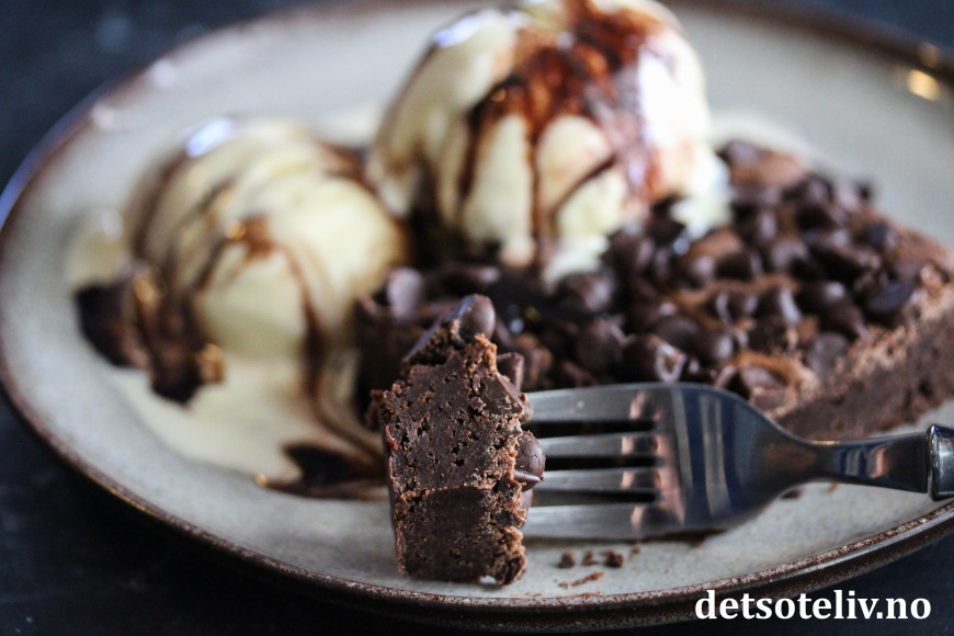 Del kaken i 6 store stykker. Server med vaniljeis og sjokoladesaus!