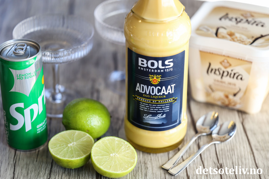 Bland eggelikør sammen med presset saft av en halv lime og halvparten av sitronbrusen, slik at eggelikøren blir tynnet ut.