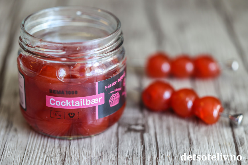 ♥ Dersom du vil pynte glasset med cocktailbær, får du kjøpt disse i vanlige matbutikker.