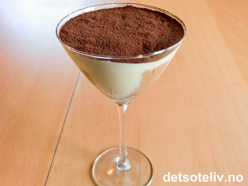 Dypp kjeks raskt i kaffeblandingen slik at den trekker inn i kjeksen, og legg så kjeks raskt i bunnen av glasset. Fordel osteblandingen over så halve glasset blir fylt. Gjenta med et nytt lag dynkede kjeks. Fyll opp glasset med resten av osteblandingen. Sikt over et tykt lag kakao til slutt.