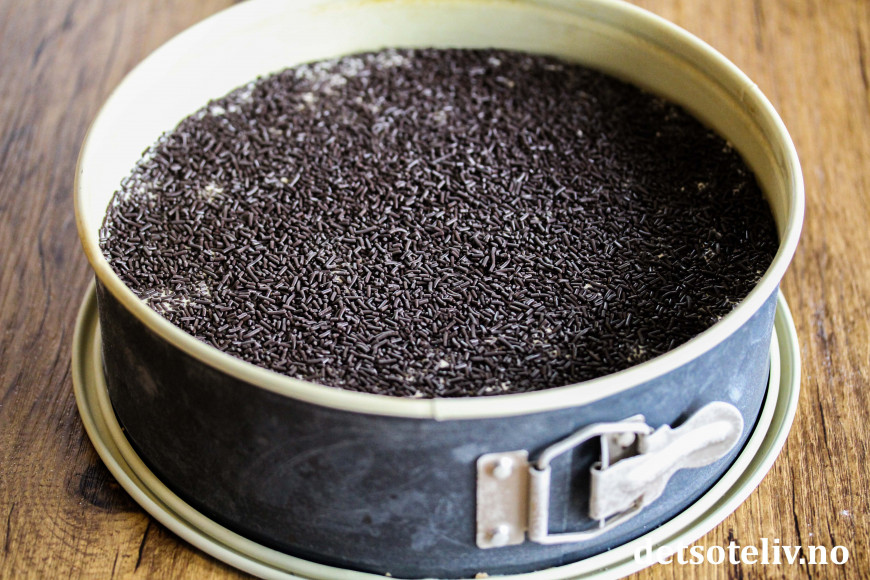 Det er ikke nødvendig å smøre eller ha bakepapir i bunnen av formen før du har i den knuste kjeksen. Når iskaken er frossen løsner den uansett lett fra formen.