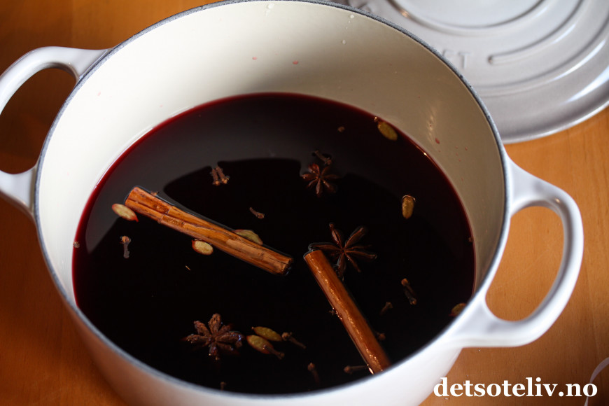Kok opp blandingen. Ta kjelen så av platen og la gløggen trekke i minst 30 minutter slik at krydderet får satt smak på gløggen.