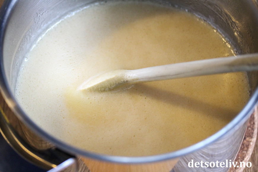 Smelt smøret i en kjele. Ta kjelen av platen og tilsett melken.