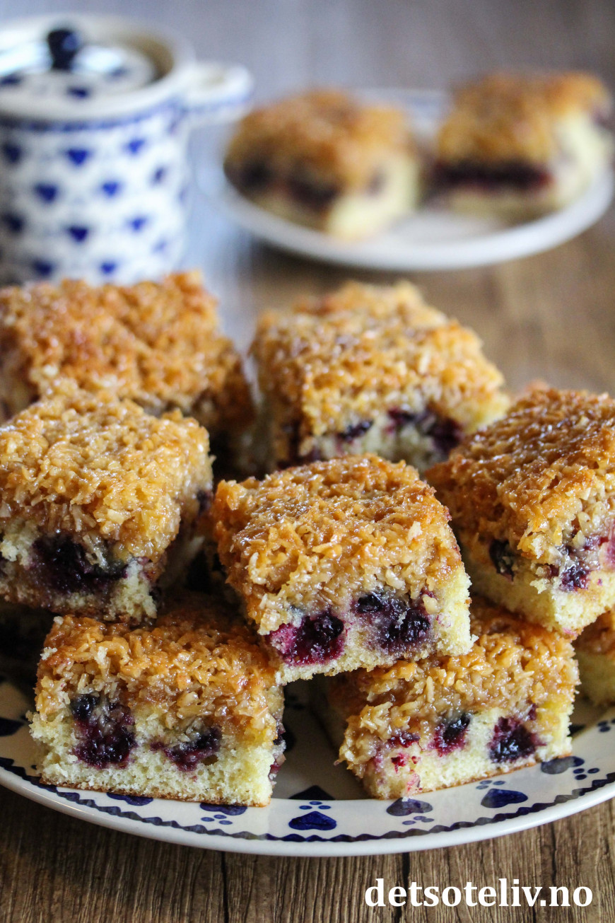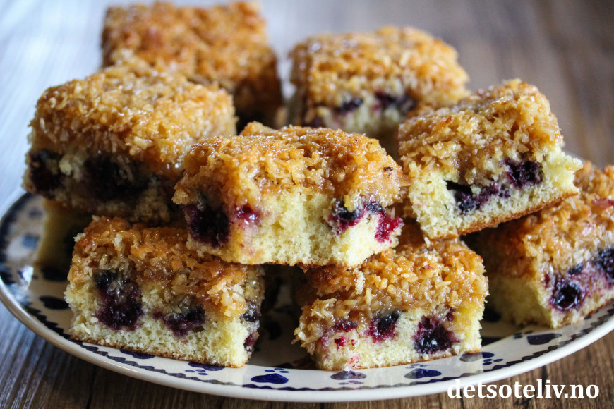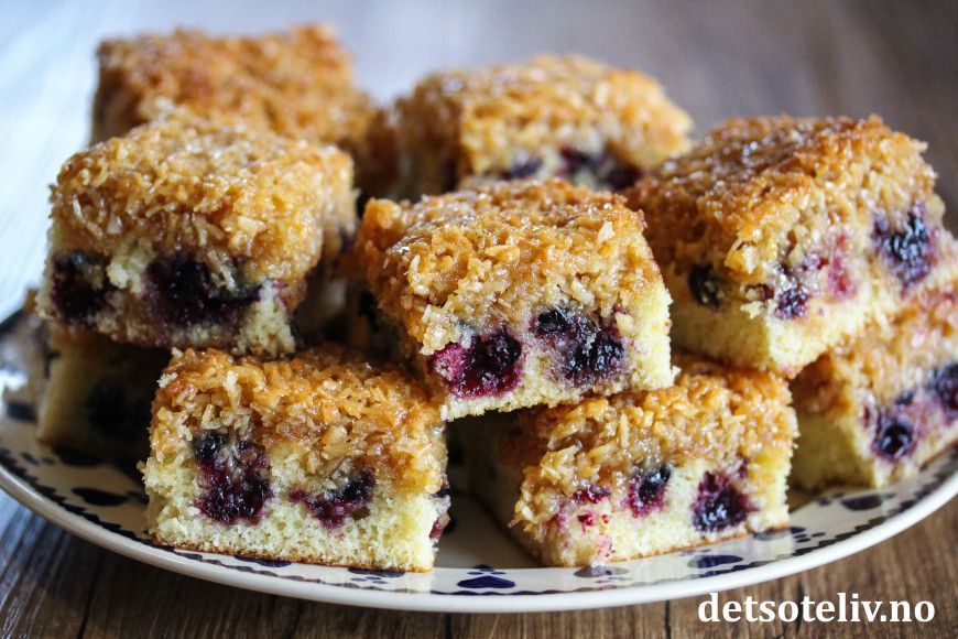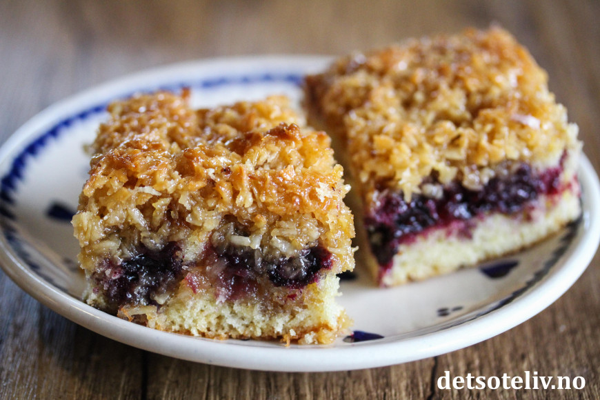 Dette er en fantastisk god langpannekake med deilige solbær og herlig, småseig, karamellisert kokosglasur på toppen.