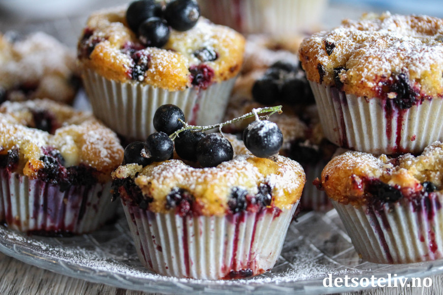 ♥ Du kan bruke friske eller frosne solbær. Bruker du frosne, trenger de ikke å tines først. Oppskriften kan også brukes for å lage muffins med for eksempel rips eller blåbær. Se også Rabarbramuffins med marsipan og hvit sjokolade, som er basert på samme oppskrift som denne.