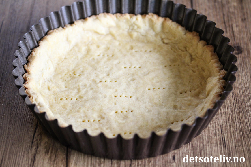 Klem deigen utover i en smurt paiform (22 cm i diameter, gjerne med løs kant). Sett formen i kjøleskapet i 30 minutter.