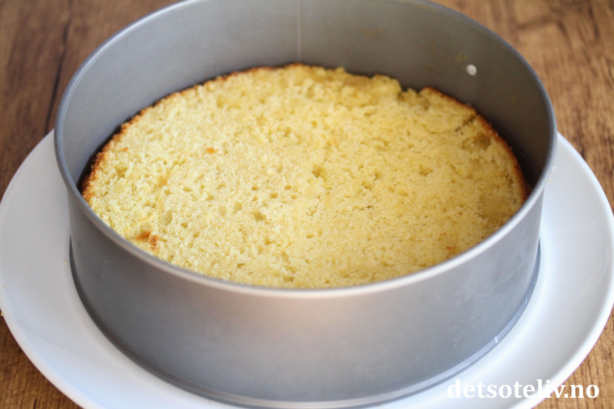 Ha deigen i en rund form (24 cm i diameter) og stek den midt i ovnen ved 175°C i ca. 15-20 minutter (sjekk med kakenål at kaken er gjennomstekt). Avkjøl kaken til den er helt kald.