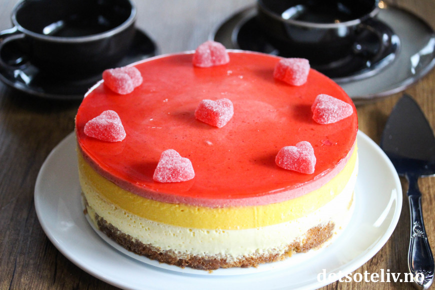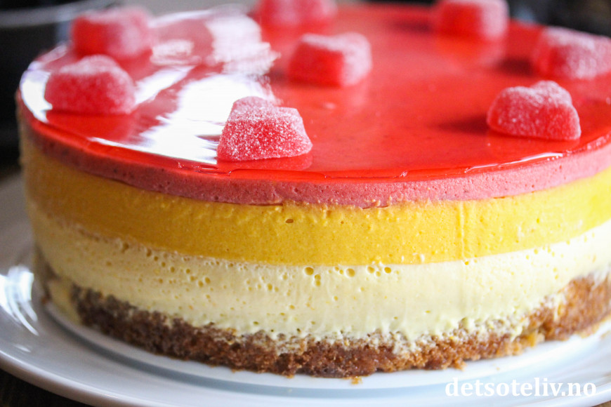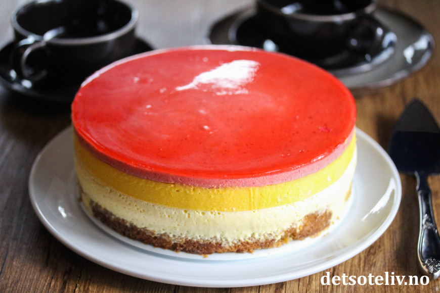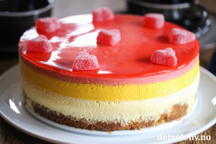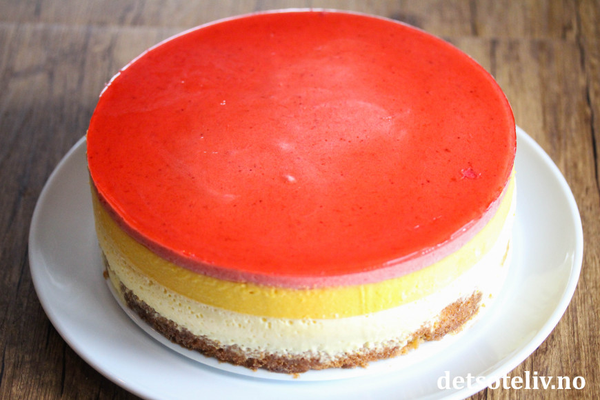 Jeg komponerte denne kaken med solnedgangsfarger, som består av myk vaniljekakebunn, appelsinfromasj, mangofromasj, jordbærfromasj og et tynt lag jordbærgelé på toppen. Kaken ble veldig godt mottatt og smaker fantastisk!