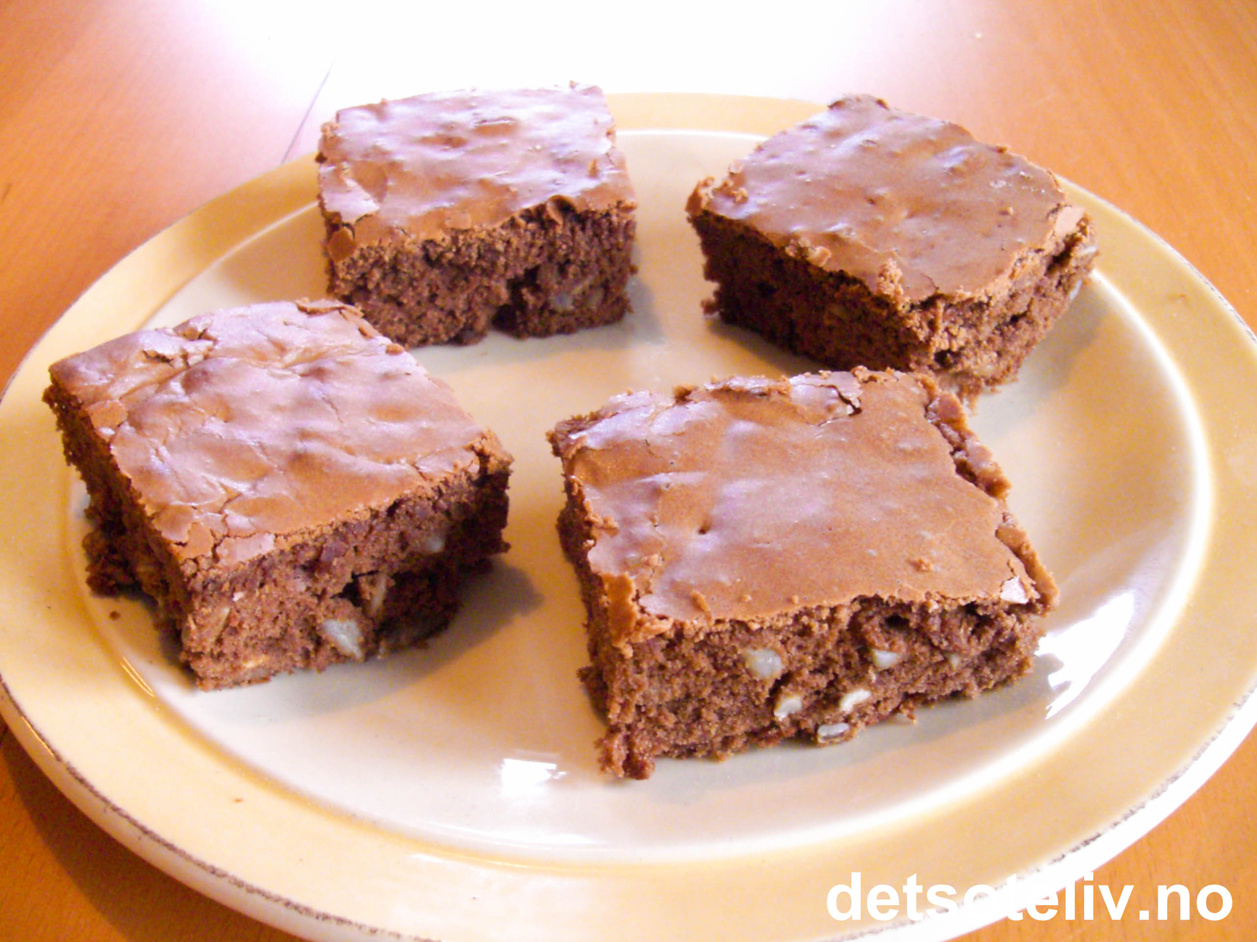 Hell røren i en stor, bakepapirkledd langpanne (ca 30x40 cm). Stek kaken nederst i ovnen ved 200°C i 20 minutter. Kaken skal ha litt bløt kjerne. Avkjøl kaken helt i formen. Del opp i ruter før servering.