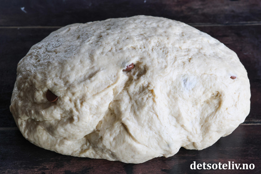 Ha deigen ut på bakebordet og kna inn melkesjokoladechips (eller grovt hakket melkesjokolade).