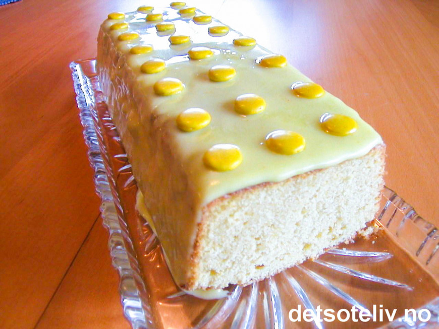 Sett kaken på et passende fat. Rør sammen melisglasur og stryk over den kalde kaken i et tynt lag. Pynt kaken etter ønske, for eksempel med gule Non Stop. La kaken stå til melisglasuren har stivnet.