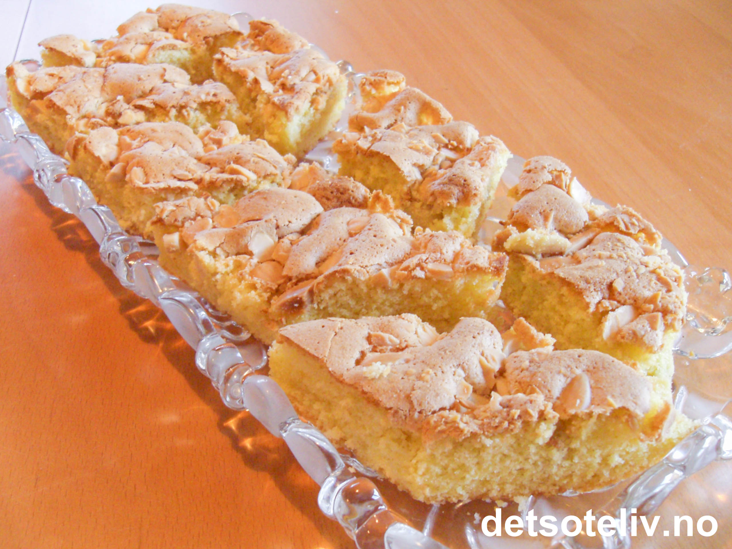 Ha deigen i en liten, bakepapirkledd langpanne (ca 20x30 cm). Skåld og hakk mandlene (se tips) og dryss over deigen.