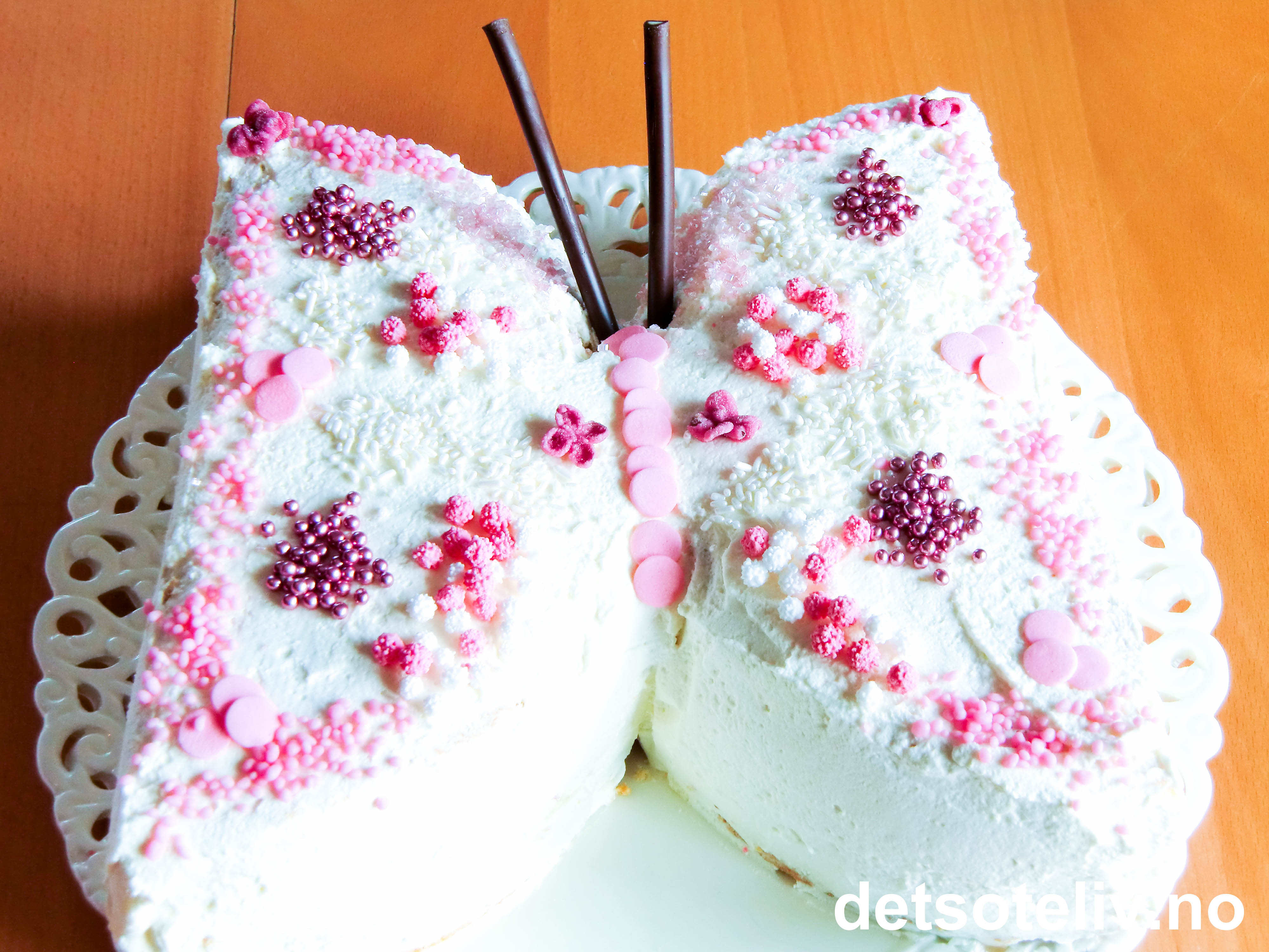 Pisk egg og sukker til stiv eggedosis. Sikt mel og bakepulver og vend den inn i eggedosisen. Ha deigen i en rund form (26 cm i diameter) med bakepapir i bunnen. Stek kaken midt i ovnen ved 180°C i 40 min. Avkjøl kaken i formen før den løsnes. Fjern bakepapiret og del kaken i 3 bunner. Legg disse oppå hverandre og del så kaken på midten, slik at du får 6 halve kakebunner. Disse skal legges mot hverandre, slik at kaken får sommerfuglfasong. Dynk bunnene med litt melk.