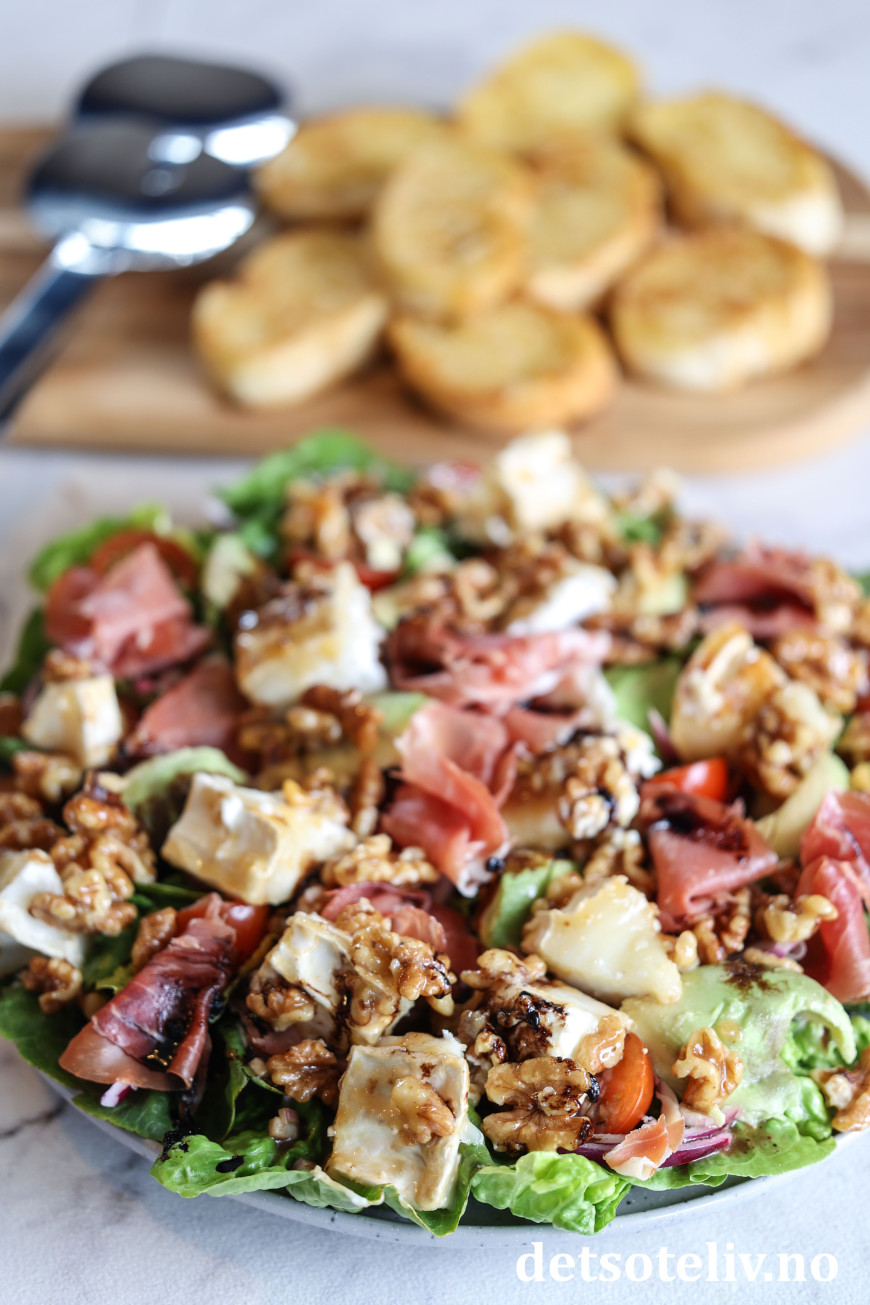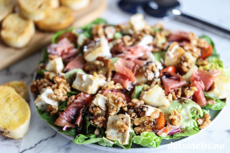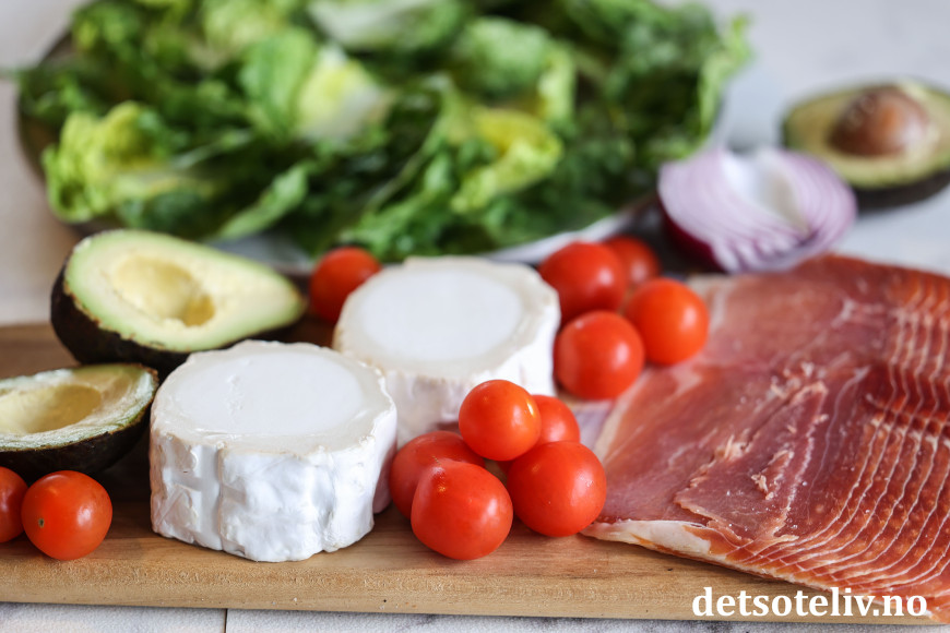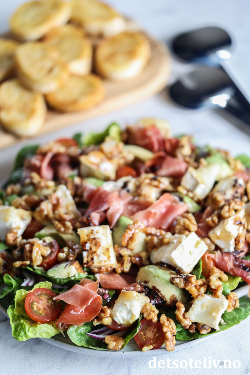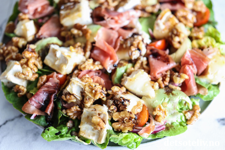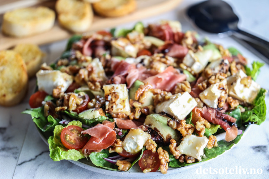 Denne salaten kombinerer lune biter chèvre med spekeskinke, avokado, rødløk, søte tomater og honningstekte valnøtter. Hjertesalat vendes sammen med en kjempegod balsamicovinaigrette.