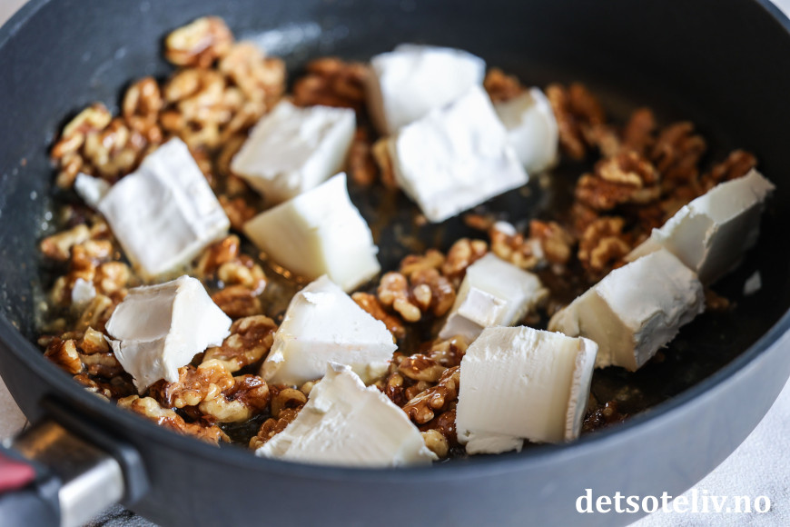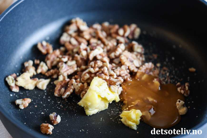 Ha smør, honning og valnøtter i en stekepanne. Varm opp på middels varme, helt til nøttene får en gyllenbrun og karamellisert overflate. Rør ofte og følg med slik at nøttene ikke blir brente. Legg store biter chèvre i pannen helt på slutten.