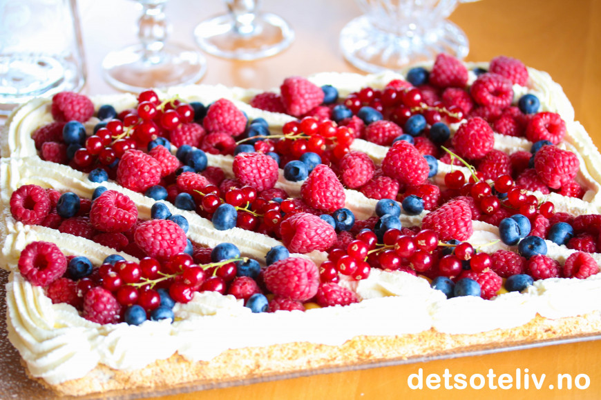 Dette er en stor suksesskake som dekkes med både deilig Firkløverkrem og gul suksesskrem, og deretter søt, pisket fløtekrem og til slutt masse friske bær.