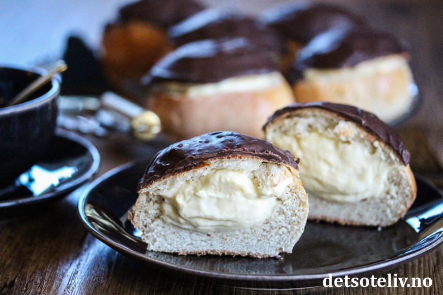 "Sørlandsboller" er store og VIDUNDERLIGE hveteboller som er fylt med masse, masse vaniljekrem og dekket med deilig sjokoladeglasur.... NAM, NAM!