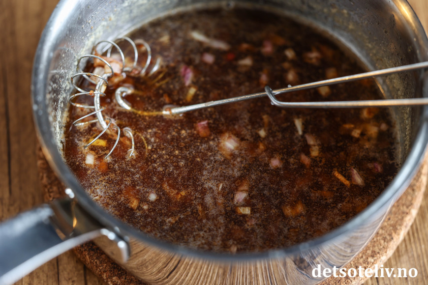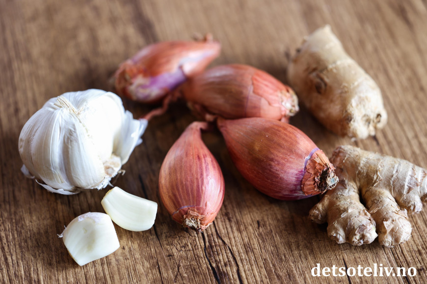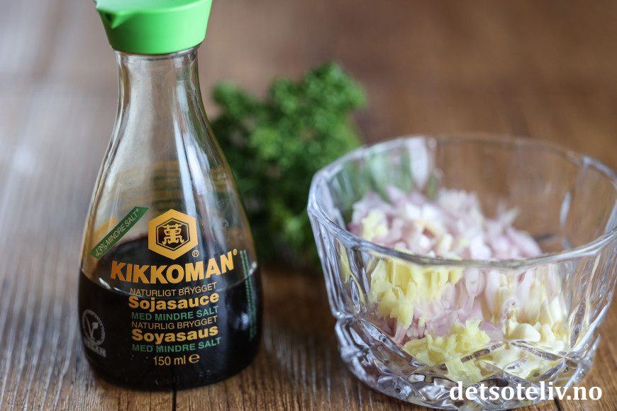 Bland soyasaus i smøret. Hakk hvitløk og sjalottløk helt fint og tilsett. Skrell ingefær og riv på fint rivjern slik at du får en ingefærmos. Mål opp 1 teskje og ha dette i sausen.