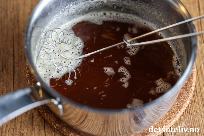 Varm det opp og la det smelte. Fortsett så å varme det opp også etter at det er smeltet, mens du visper i det hele tiden. Du vil etter hvert se at smøret blir lysebrunt i fargen og merke at det får en herlig nøtteaktig lukt. Ta det da straks av varmen.