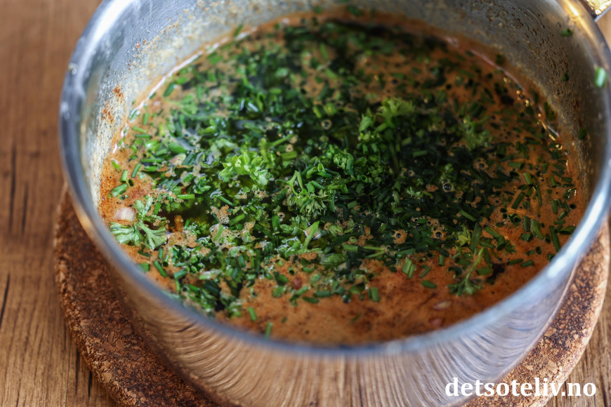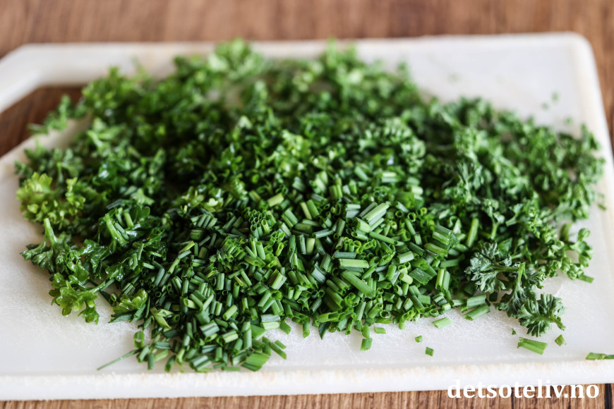 Som urter liker jeg å bruke en kombinasjon av frisk kruspersille og gressløk.