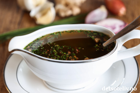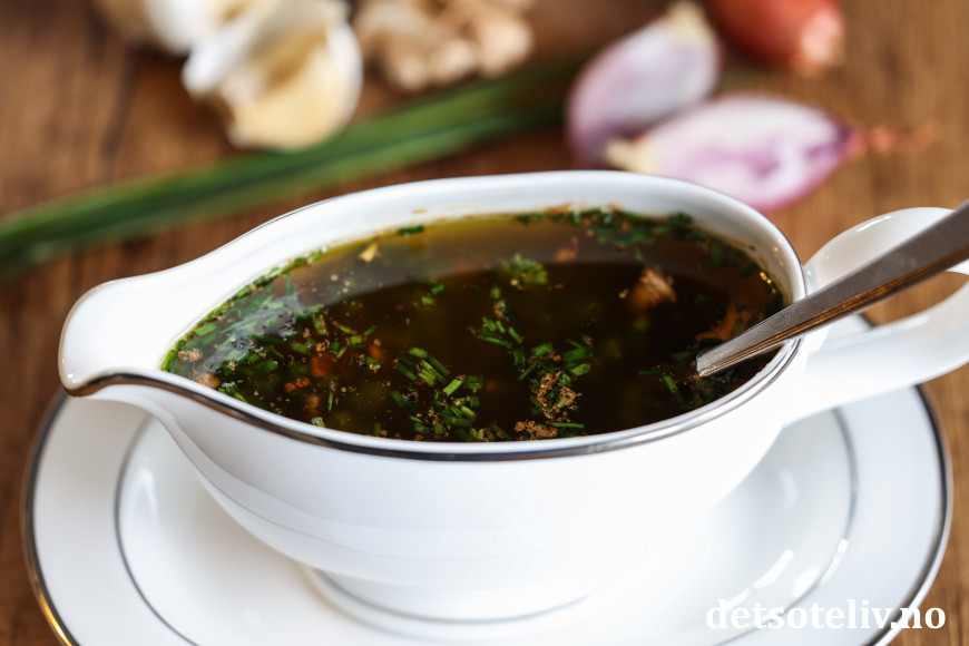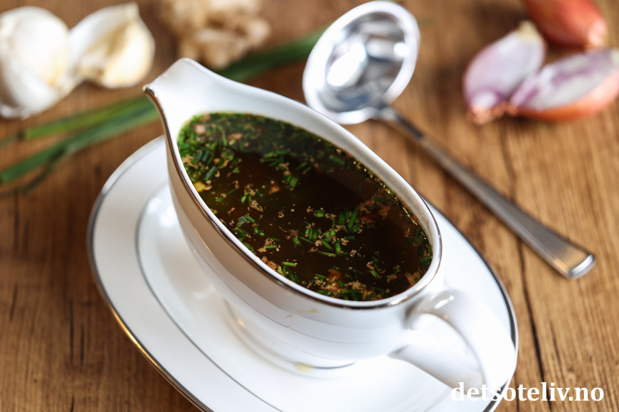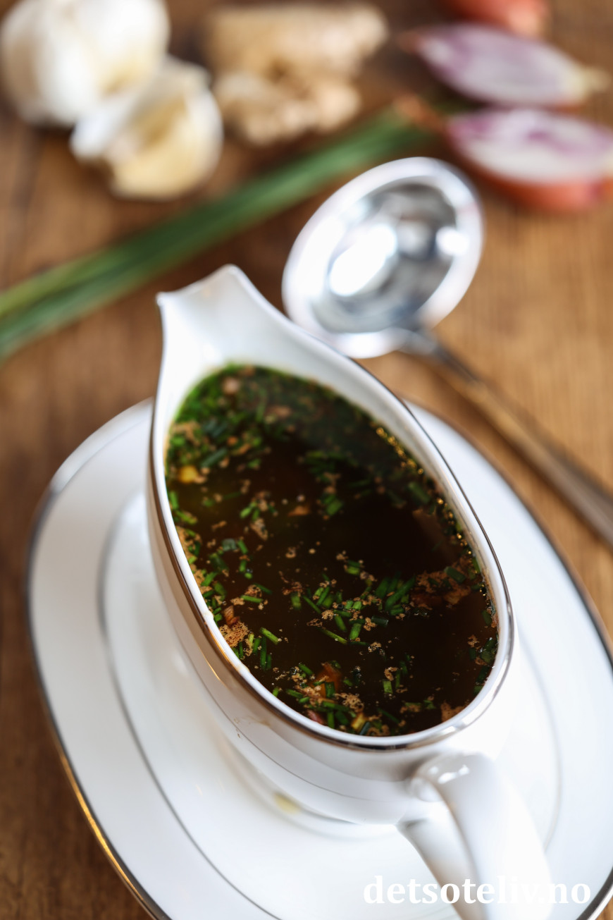 Denne populære sausen lages på brunet smør og soyasaus, finhakket sjalottløk og hvitløk, revet ingefær og friske krydderurter.