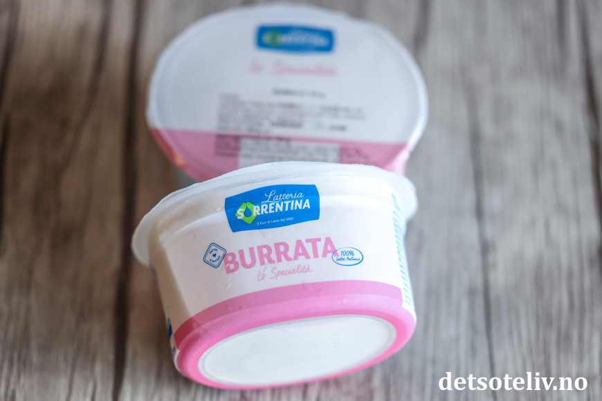 ♥ Burrata er en italiensk ferskost som består av fast mozzarella som fylles med en kremete ostemasse som lages av revet, fersk mozzarella og fløte (fyllet kalles for "stracciatella"). På samme måte som fersk mozzarella, ligger burrata i saltet vann når du kjøper den. Forskjellen er altså at fersk mozzarella er fast tvers igjennom, mens burrata har den bløte kjernen. Jeg bruker 1 burrata per porsjon her.