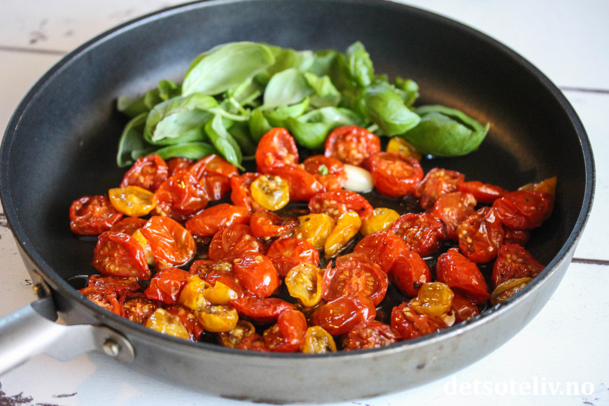 Ha konfiterte tomater (inklusive rikelig del av oljen), basilikumblader (spar noen til pynt) og hvitløksfedd i en stekepanne.