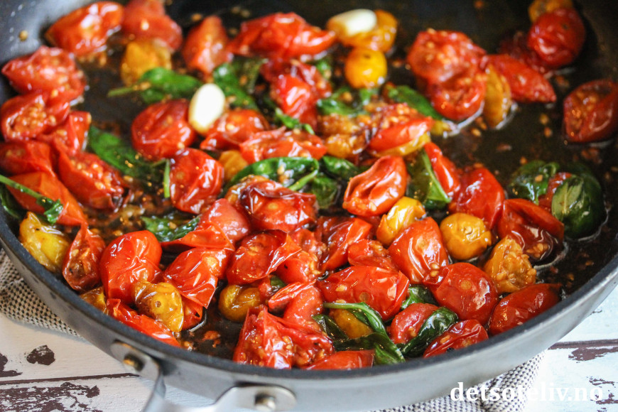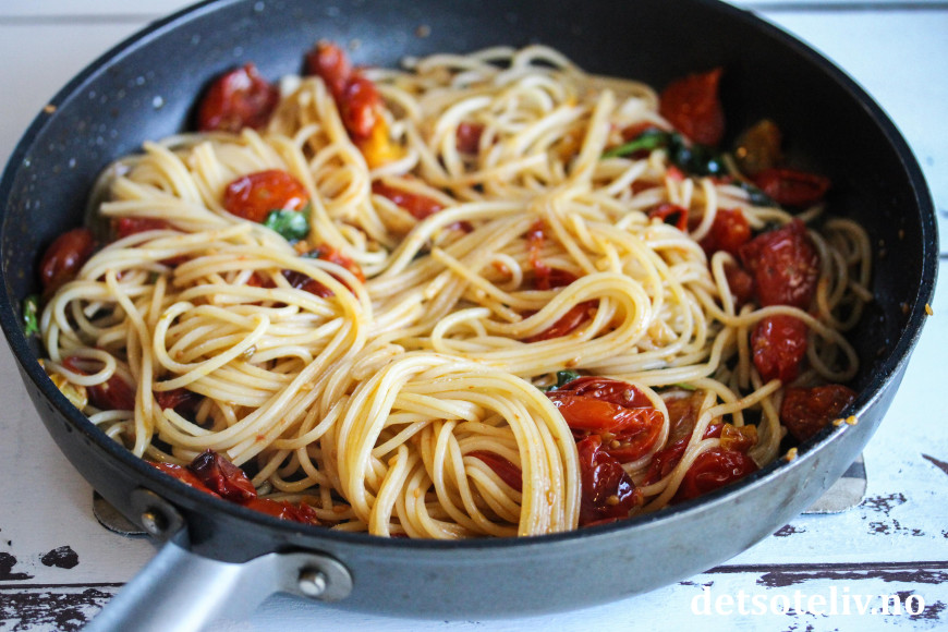 Her har jeg blandet spagetti med cherrytomater, som jeg i forkant har bakt i ovnen med olivenolje og hvitløk. Sakte varmebehandling over lang tid gjør at de små, søte cherrytomatene forvandler seg til deilige smaksbomber (se innlegg om konfiterte tomater).