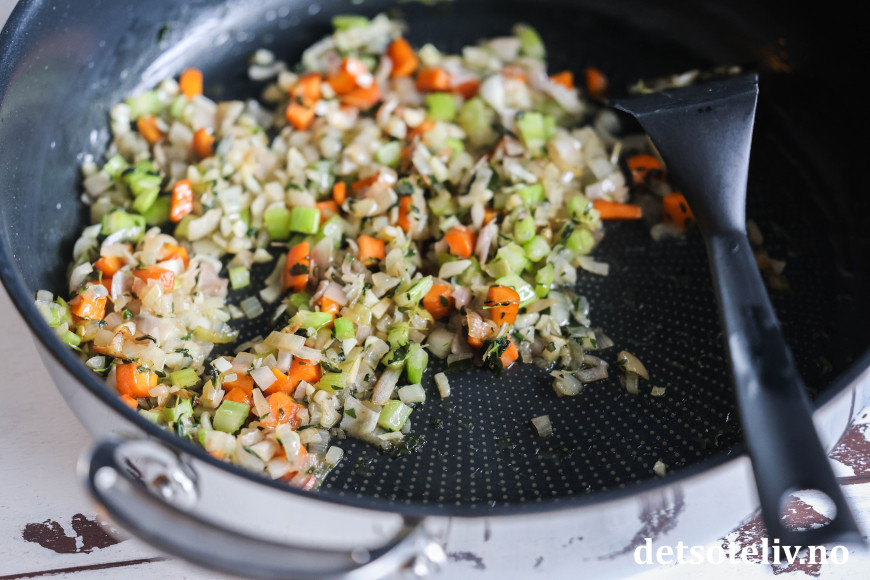 Finhakk sjalottløk, hvitløk, gulrot og stangselleri og ha dette i en panne med olivenolje. Stek denne blandingen (som kalles soffritto på italiensk) til løken er blank og gyllen.