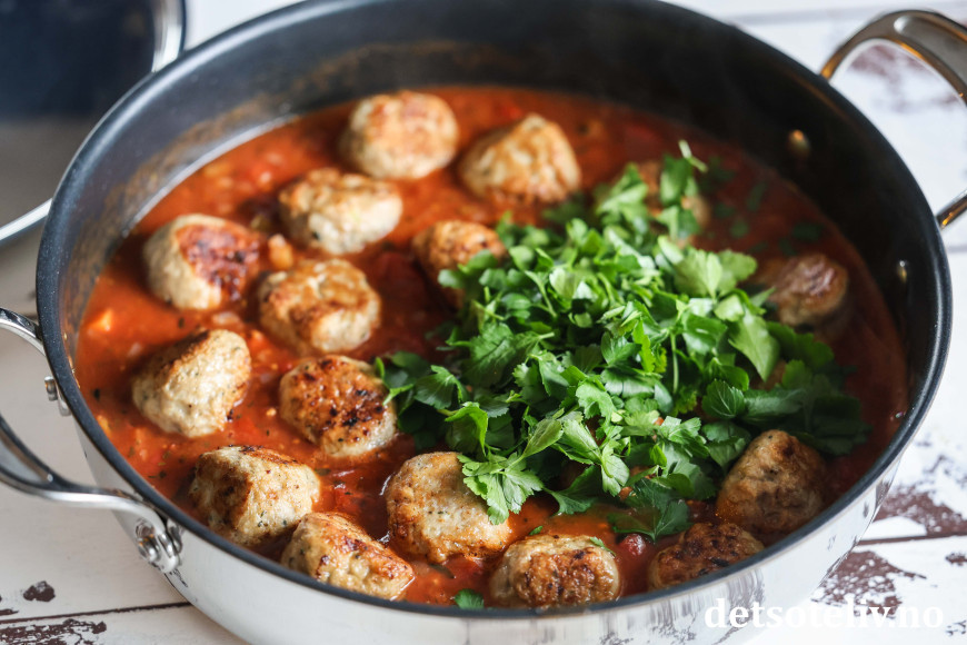 Legg så de stekte kyllingkjøttbollene i tomatsausen. Tilsett hakket bladpersille.