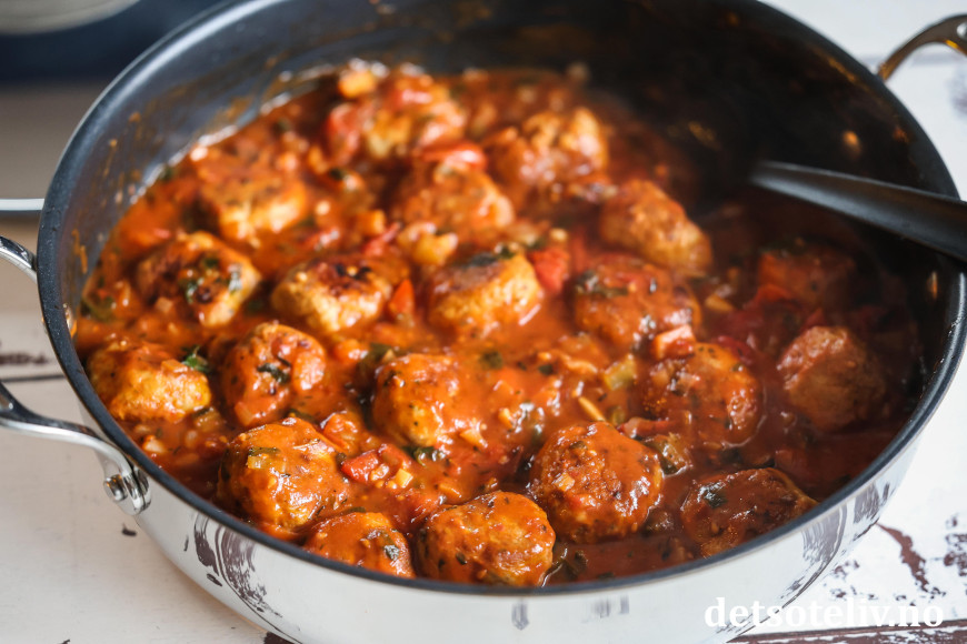 Vend om og la kyllingkjøttbollene småkoke i tomatsausen i ca. 10 minutter slik at de blir helt gjennomkokte.
