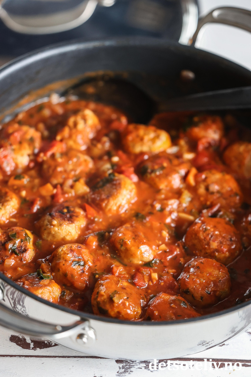 Kyllingkjøttbollene lages med kvernet kyllingkjøttdeig, løk, hvitløk, revet parmesan og italienske krydder, og er et herlig alternativ til vanlige kjøttboller. Jeg har blandet kyllingkjøttbollene med en deilig, italiensk tomatsaus, og serverer dette sammen med nykokt spagetti.