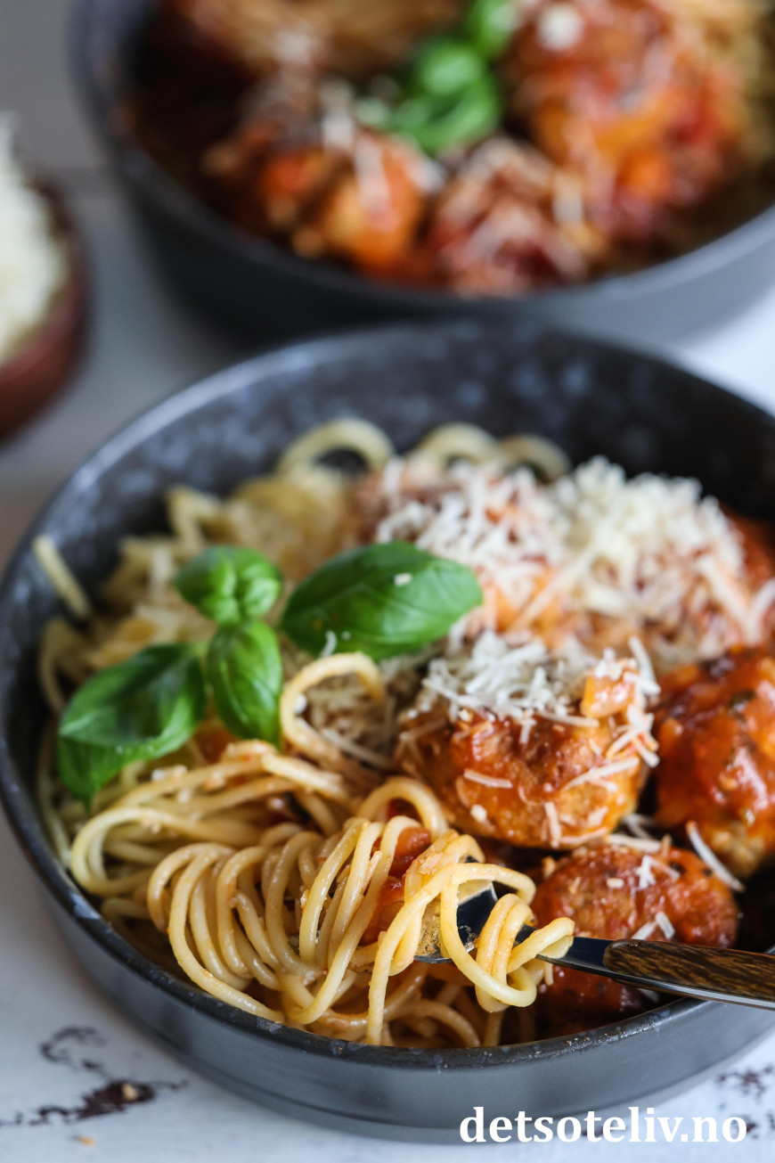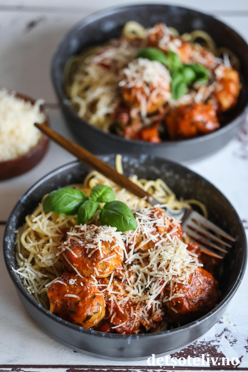 ♥ Bruk helst fersk parmesan både i kjøttbollene og revet på toppen. Det gir bedre smak enn parmesanost som kjøpes ferdigrevet.