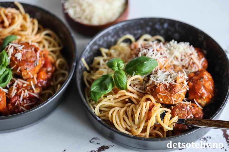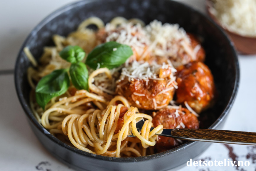 Spagetti med kyllingkjøttboller er en superpopulær middag hos store og små!