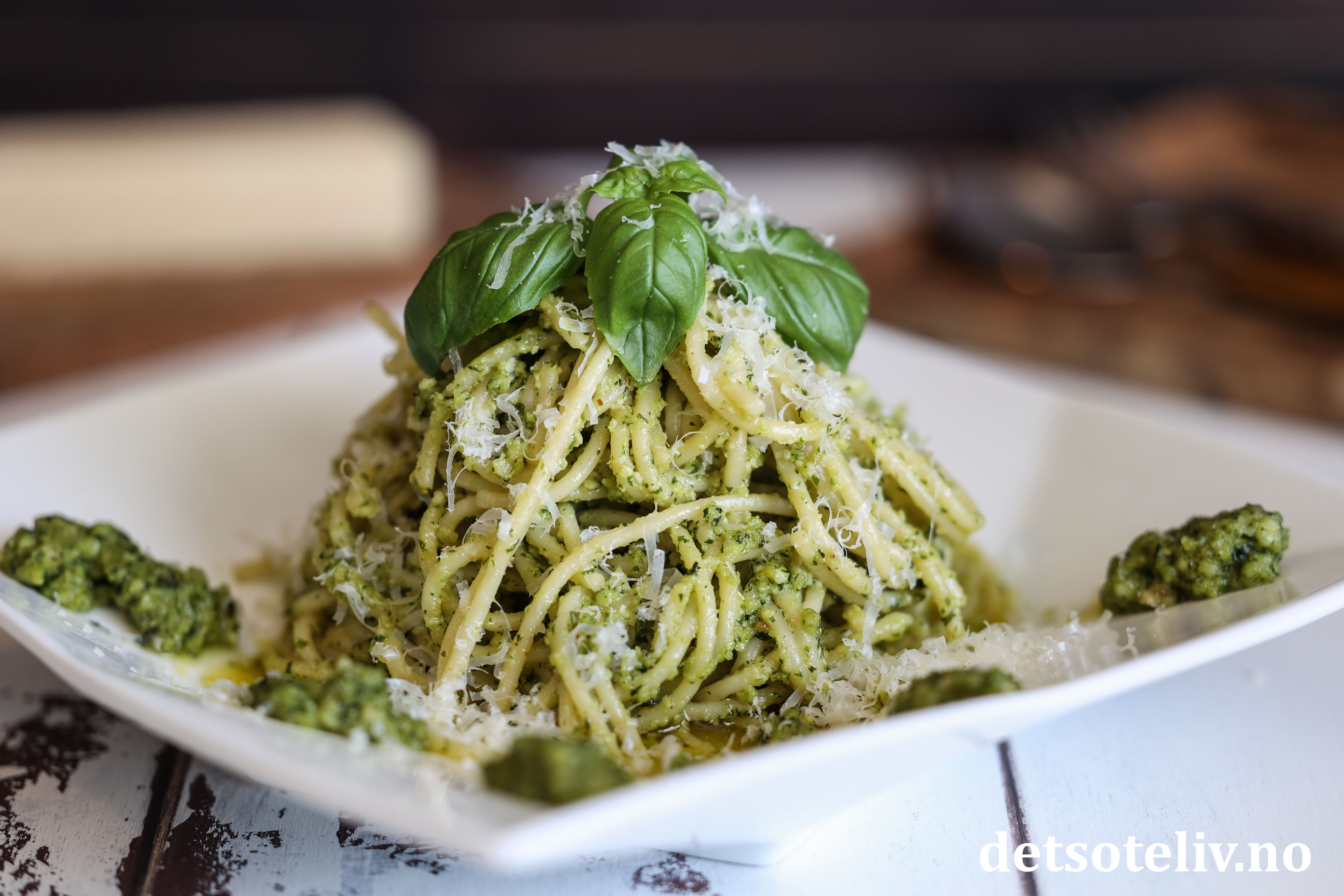 Pasta med hjemmelaget basilikumpesto (Pasta al pesto genovese) er en klassisk, italiensk pastarett.
