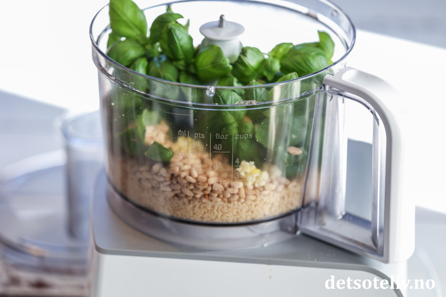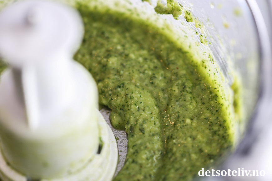 ♥ Jeg bruker omtrent hele porsjonen pesto til denne oppskriften, men dette kan du tilpasse etter smak. Pesto som du eventuelt får til overs, kan serveres ved siden av til de som vil ha litt ekstra.