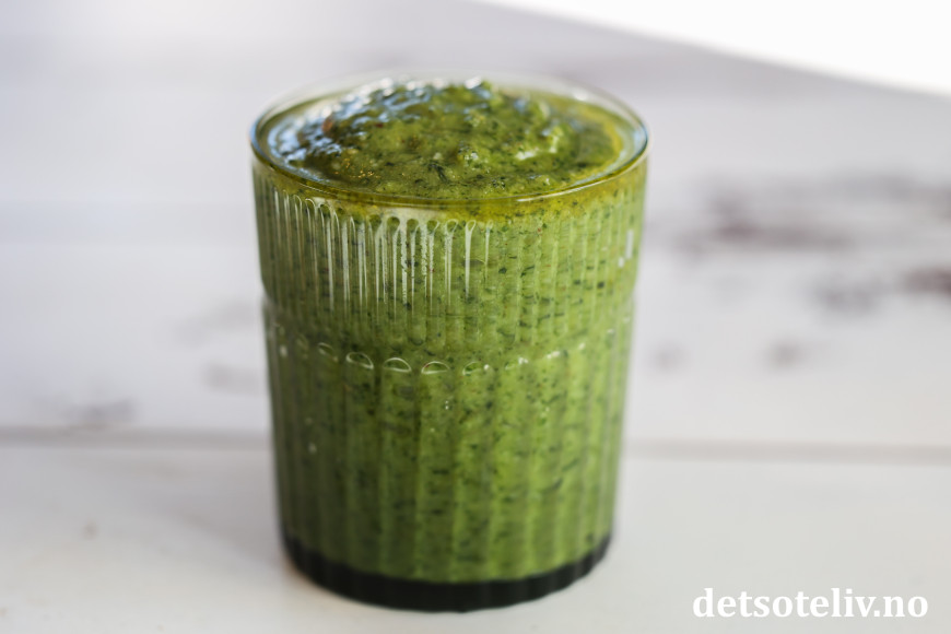 ♥ Det er ikke eksakte mål til denne oppskriften på pesto, så smak til med hvitløk, sitronsaft og salt etter din personlige smak.
